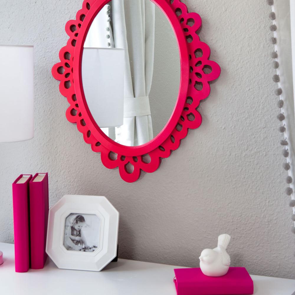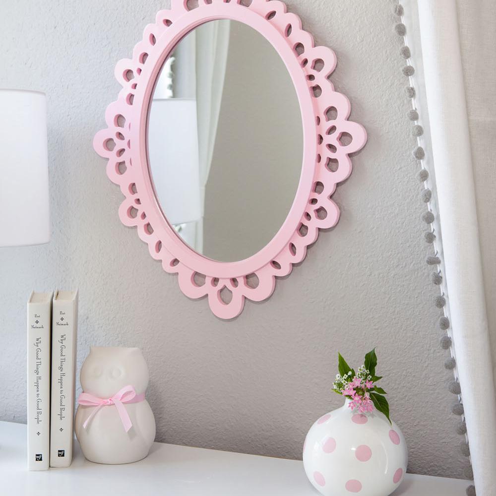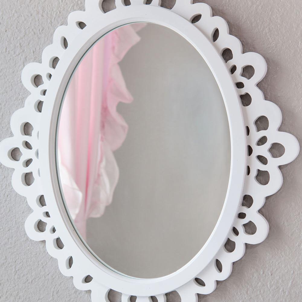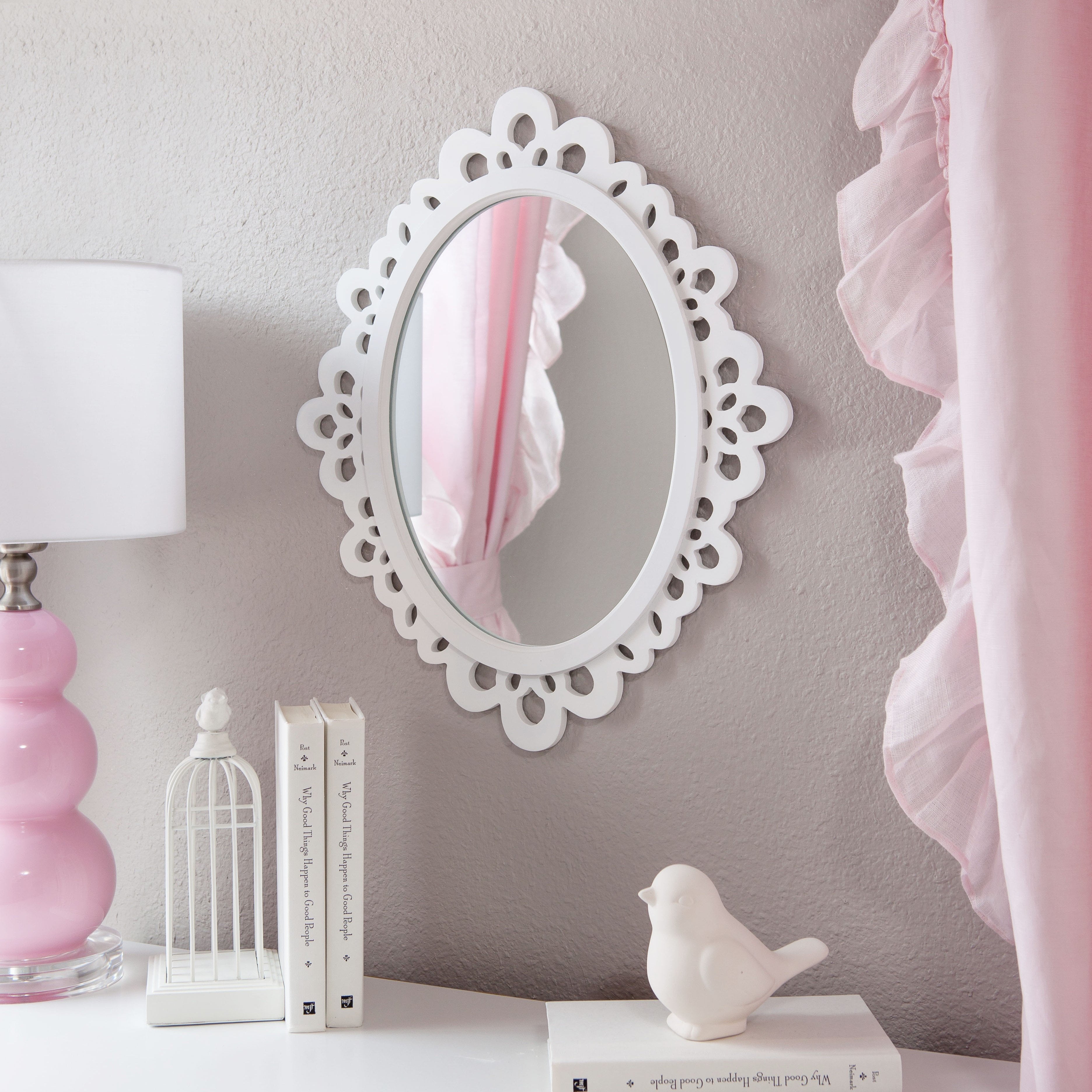 "MIRROR, MIRROR, ON THE WALLƒ" Your princess will love this fairy-tale inspired white, wooden mirror. Hang it on the wall of her royal chamber and she'll have no doubt who's the "fairest of them all."