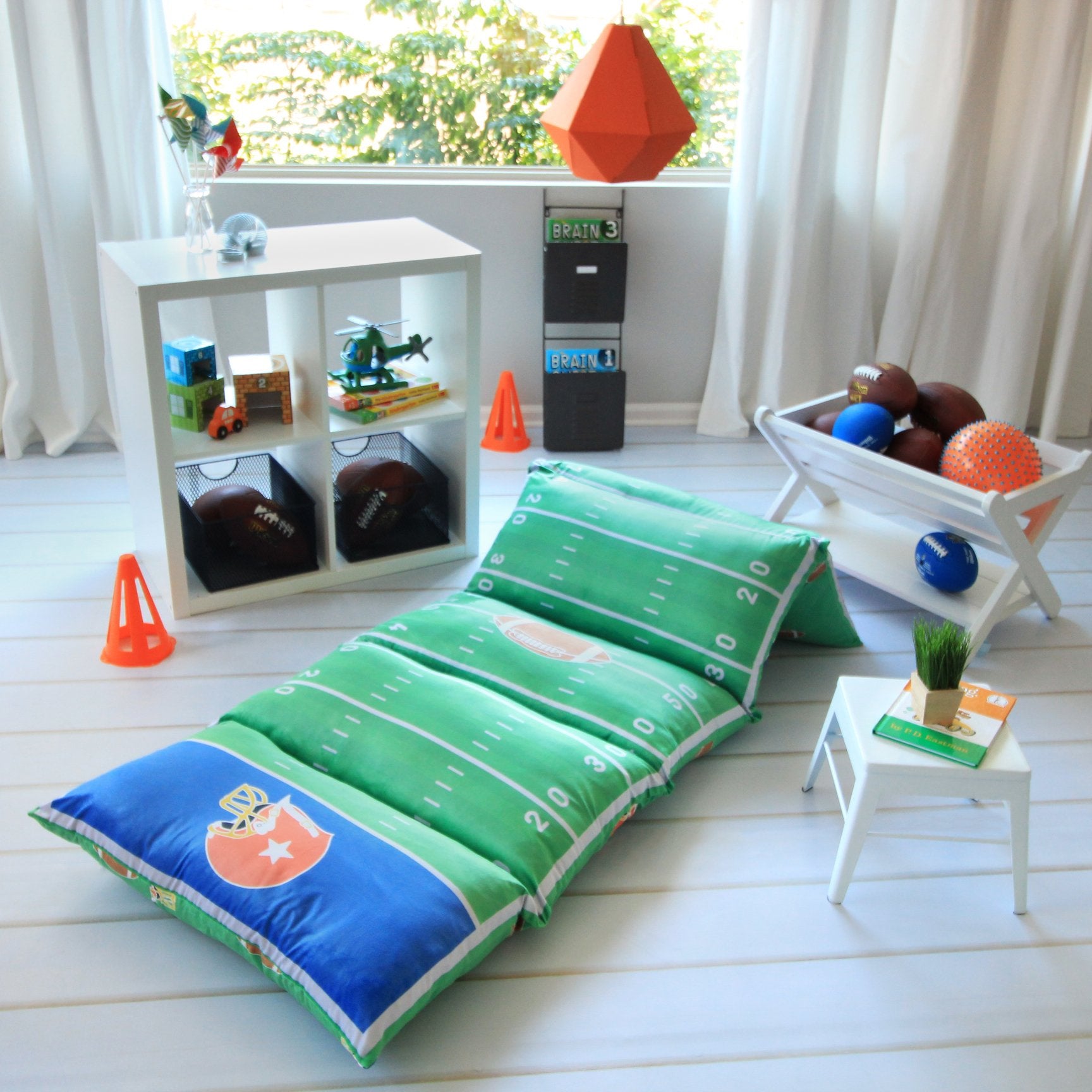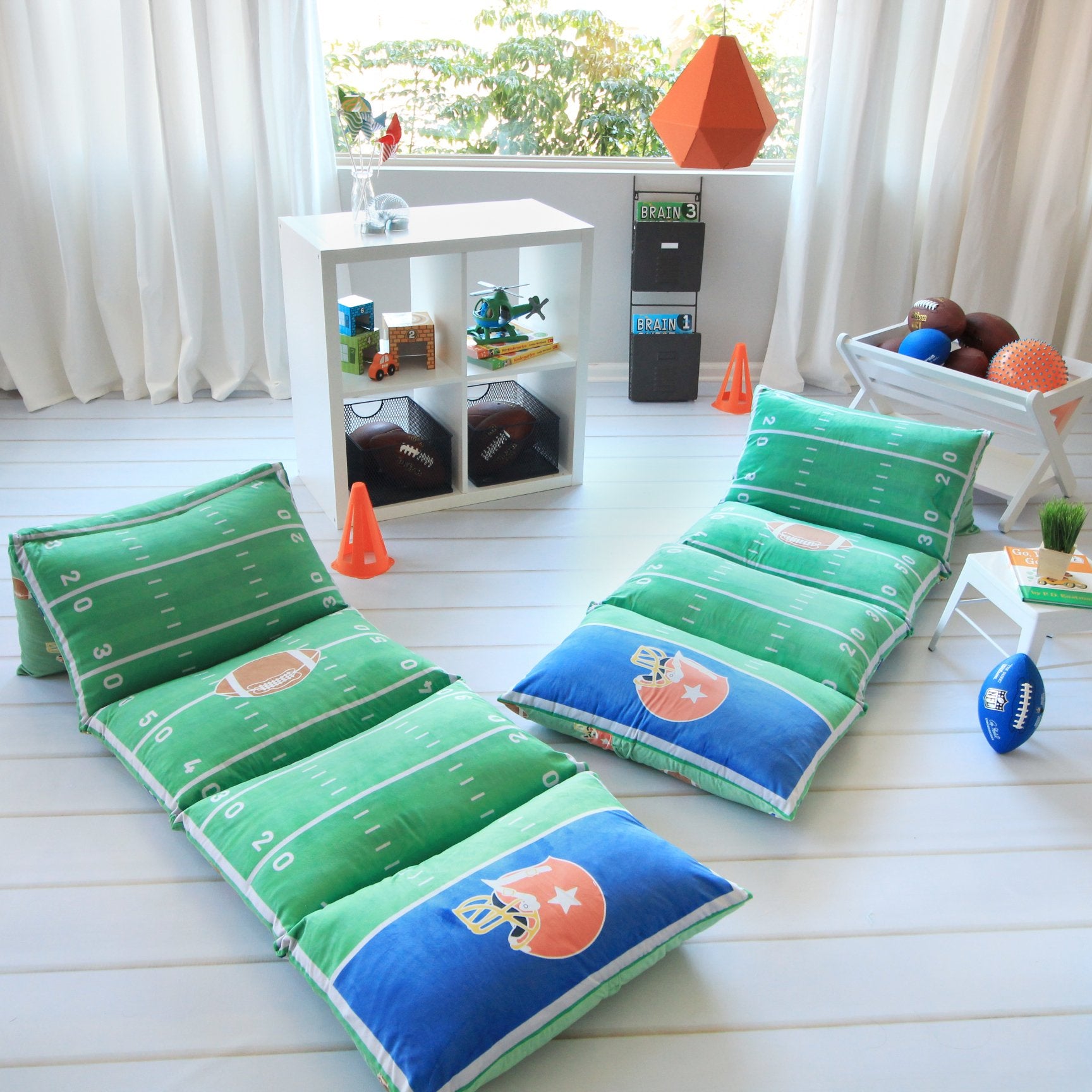 This easy-care floor pillow cover with a cool football field motif, comes in 2 different sizes: Queen and king pillow sizes. YOU provide the standard- or king-sized pillows. Our lounger pillow cover is the perfect alternative to high-dollar chairs, sofas, floor pillows and floor cushions. Cover is machine washable on delicate cycle and line dry. Great for sleep overs, watching TV and movies, extra seating, book nooks and overnight guests. Great for themed football bedrooms, game rooms and playrooms. Go for six points and make a touchdown with your football fans!