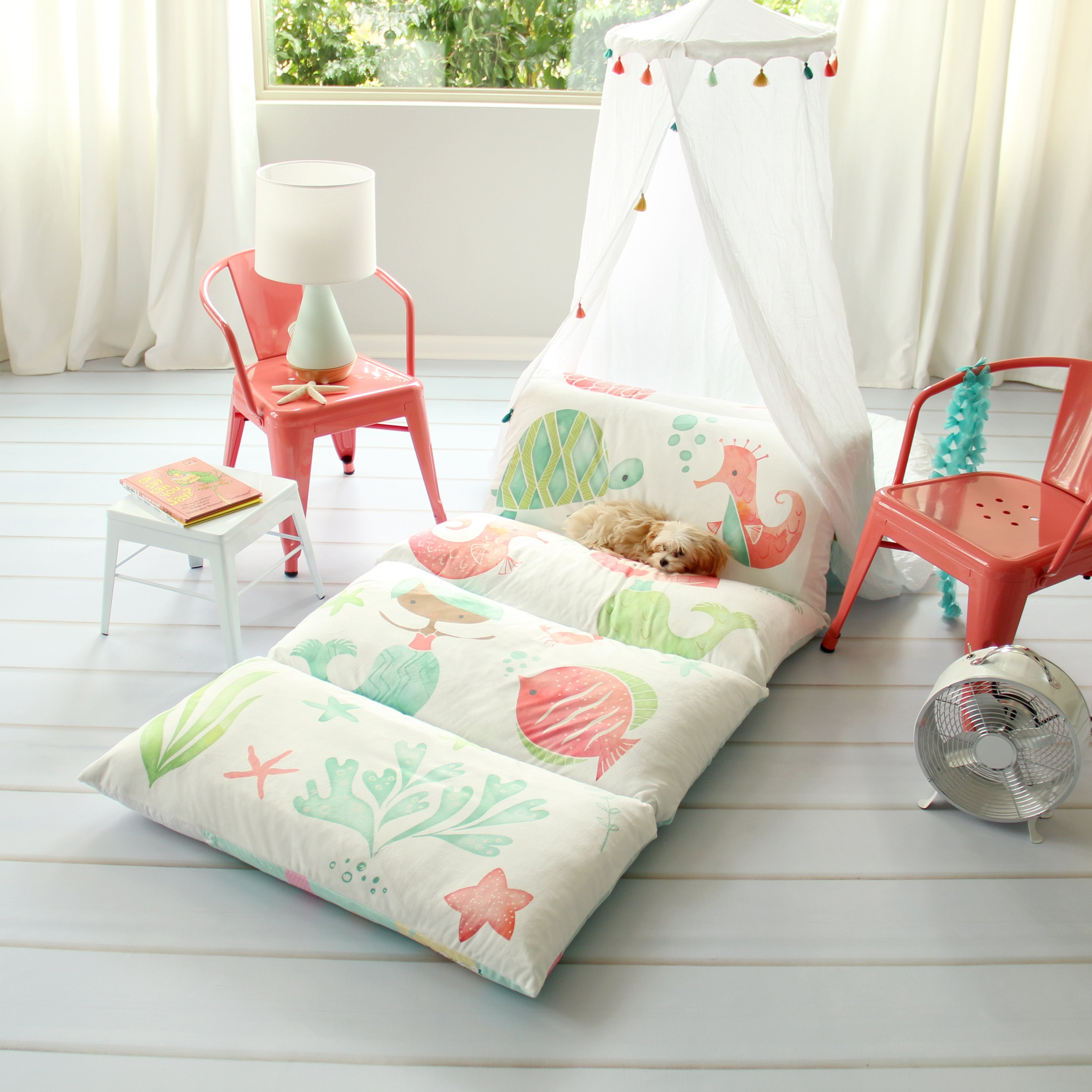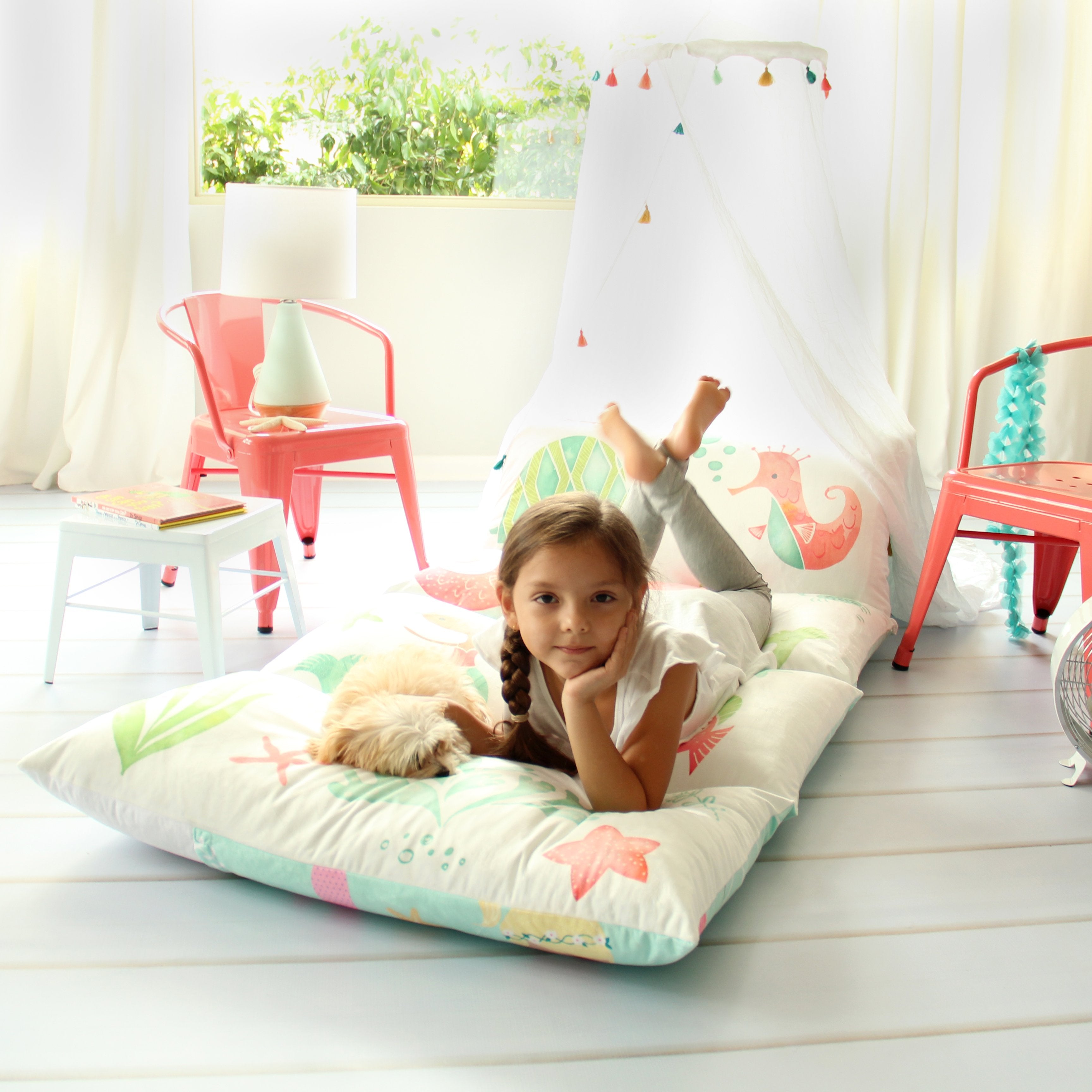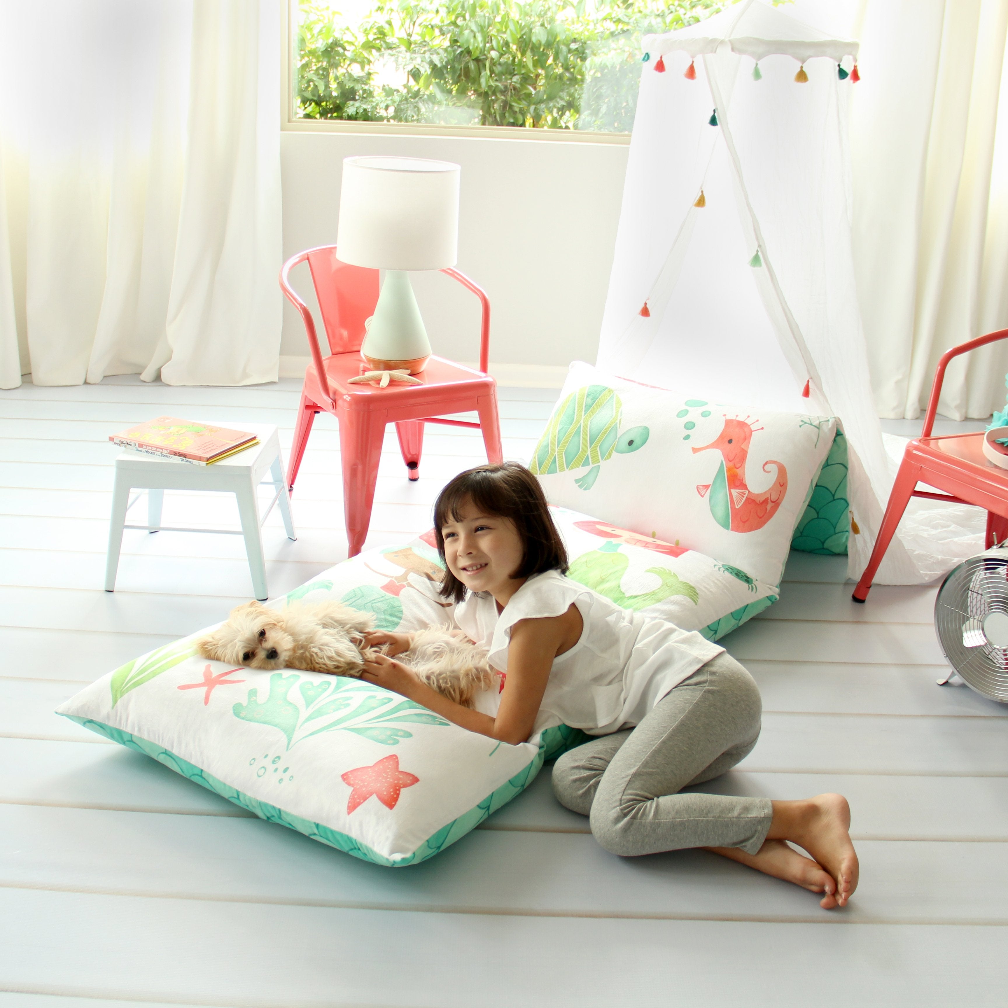 A wonderful gift for your future marine biologist or mermaid enthusiast, this easy care floor pillow cover comes in 2 different sizes: Queen and king (pillow) sizes. Perfect accessory for any themed ocean bedroom. YOU provide the standard- or king-sized pillows. Our floor lounger pillow cover is the perfect alternative to plain pillows, couches, chairs and costly furniture. Cover is machine washable on delicate cycle and line dry. Great for overnights at the grandparent's place, sleep overs, game watching, book nooks, extra seating, flooring for the play tent and extra overnight guests. Hurry and get our lounger cushion cover before high tide!